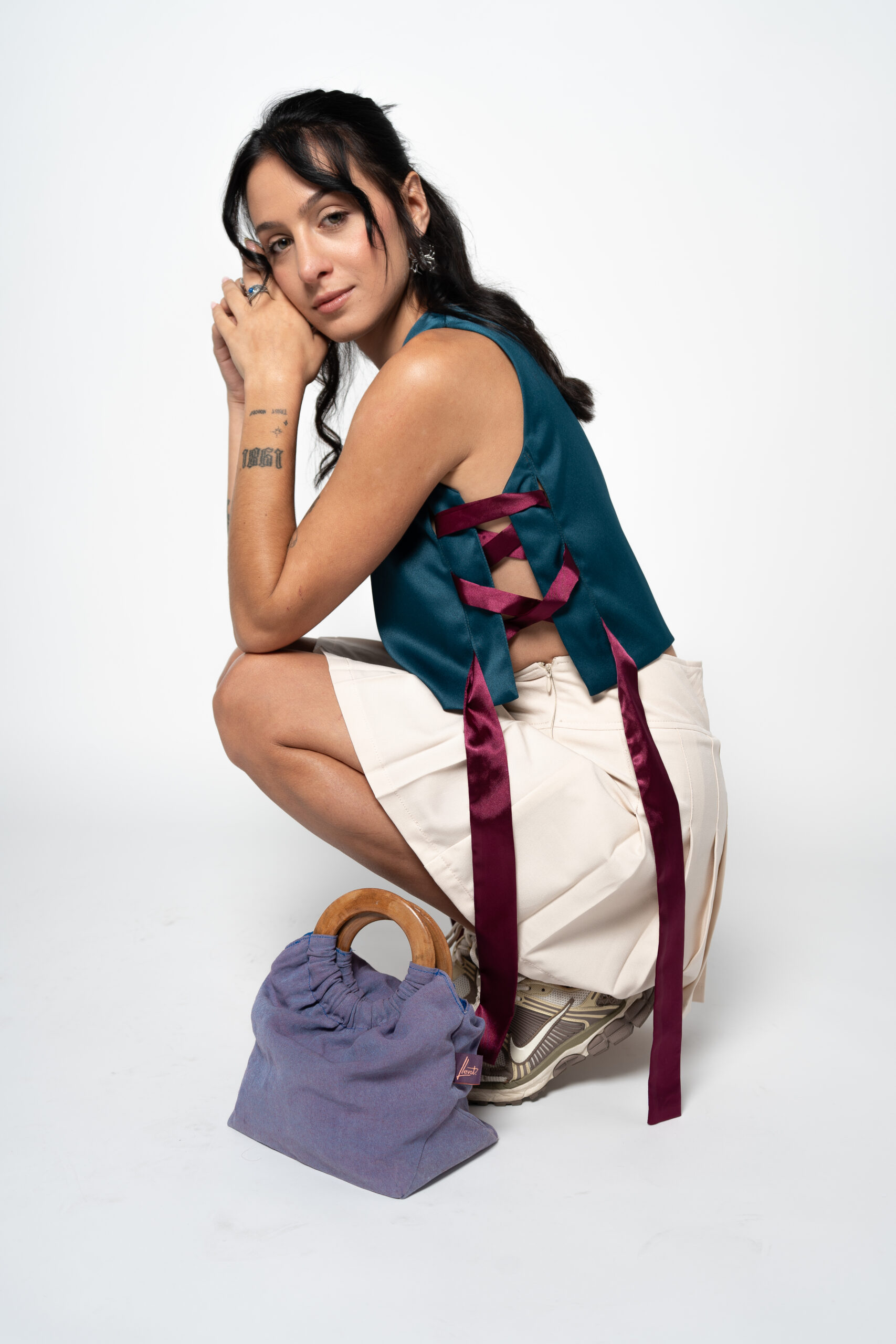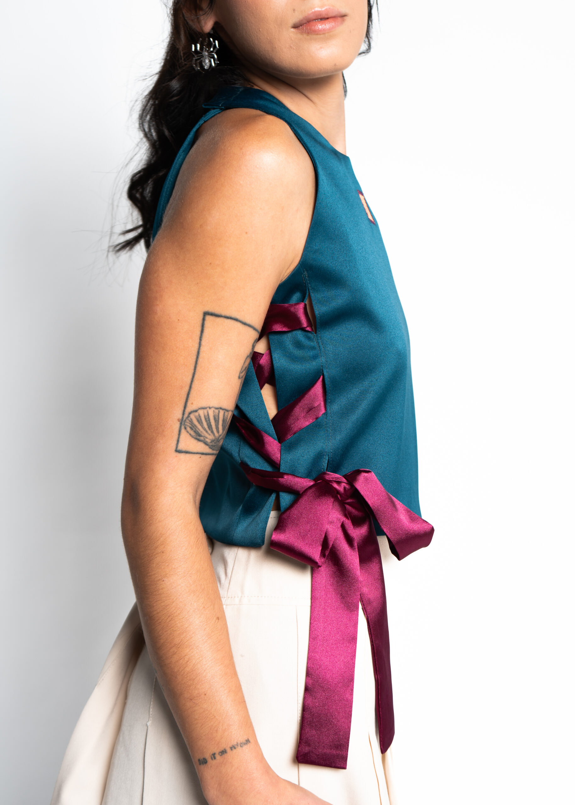 Top cropped, con abertura laterales con lazos y dos corchetes automáticos en el hombro para ponértela con facilidad.